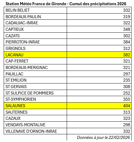 Le bassin versant des Lacs Médocains est particulièrement concerné par les pluies abondantes de ce début d’année expliquant la situation délicate de ces dernières semaines. Les stations Météo France indiquent en effet que les maximums observés depuis le début de l’année en Gironde sont situés sur les stations de Lacanau et Salaunes. Vous trouverez les données ci-dessous.